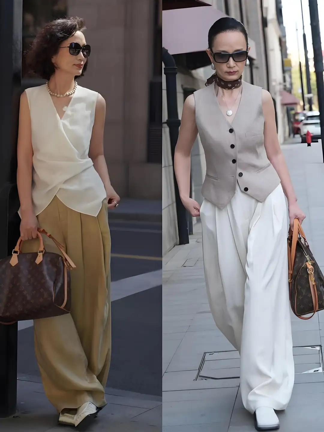 甚至我们还可以选择设计比较个性的无袖衬衫,上衣搭配上卡其色的阔腿裤或者是一款灰色的马甲上衣,搭配白色的阔腿裤,脚上穿了一双白色的皮鞋,带了一款墨镜,出门逛街或者是旅游拍照就很出片。