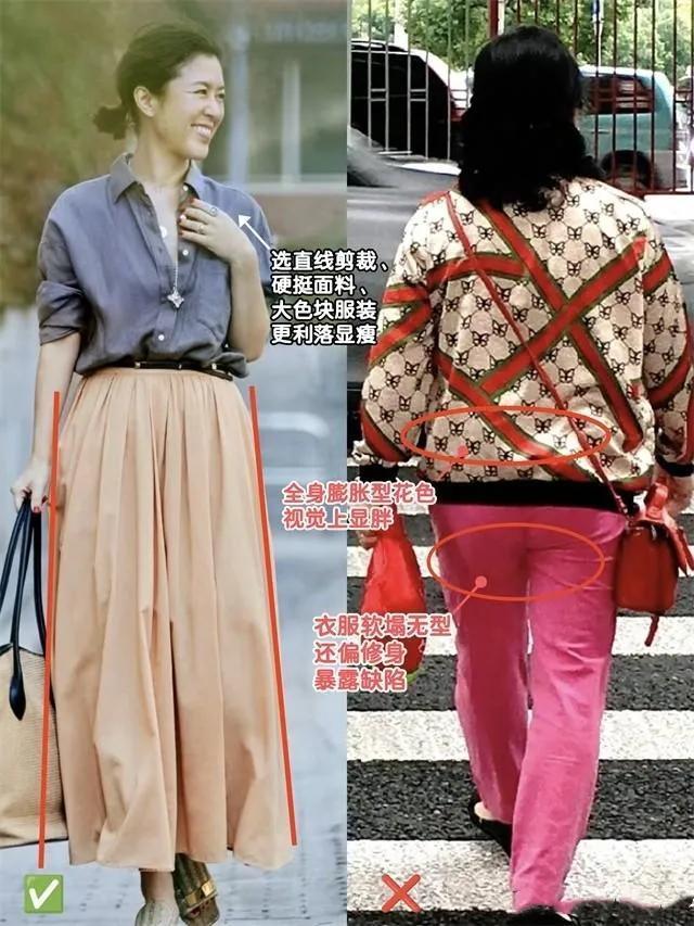 有的时候我们看到别人穿紧身裤,可能会像下面左边的这位达人一样,穿出了高挑纤瘦的身材,展现出凹凸有致的身材,但现实生活中拥有这么好的身材比例确实不太多,更不要说是中年女性了。