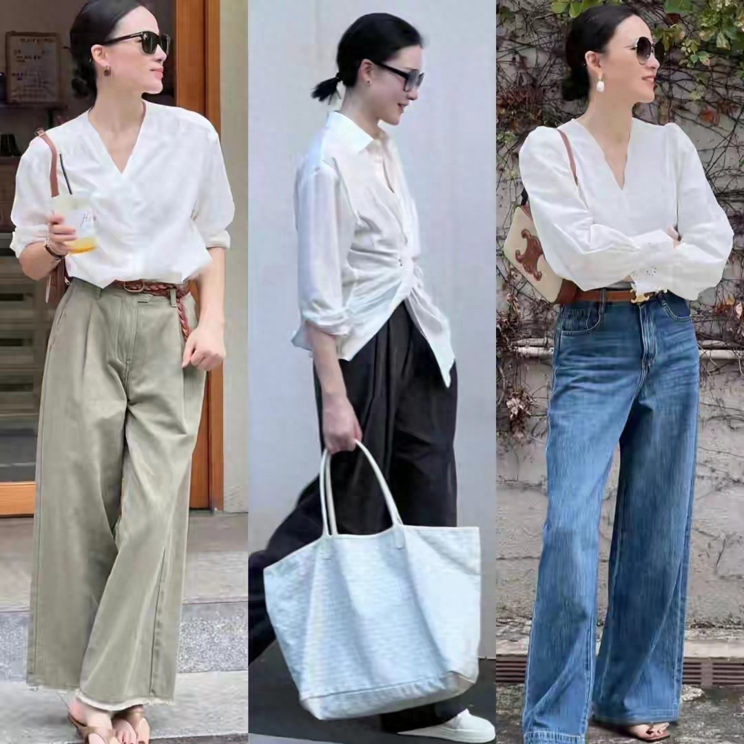 不过不管怎么选,裤子的裤脚尽量不要太长,到脚踝的位置最佳,正常情况下,像左边的这一条黑色的西装直筒阔腿裤,就有点拖沓了,素人穿出门没走几圈就沾满了灰尘,除非出门就是坐车出去,去到的地方也比较干净,那选择这样的穿搭还可以。